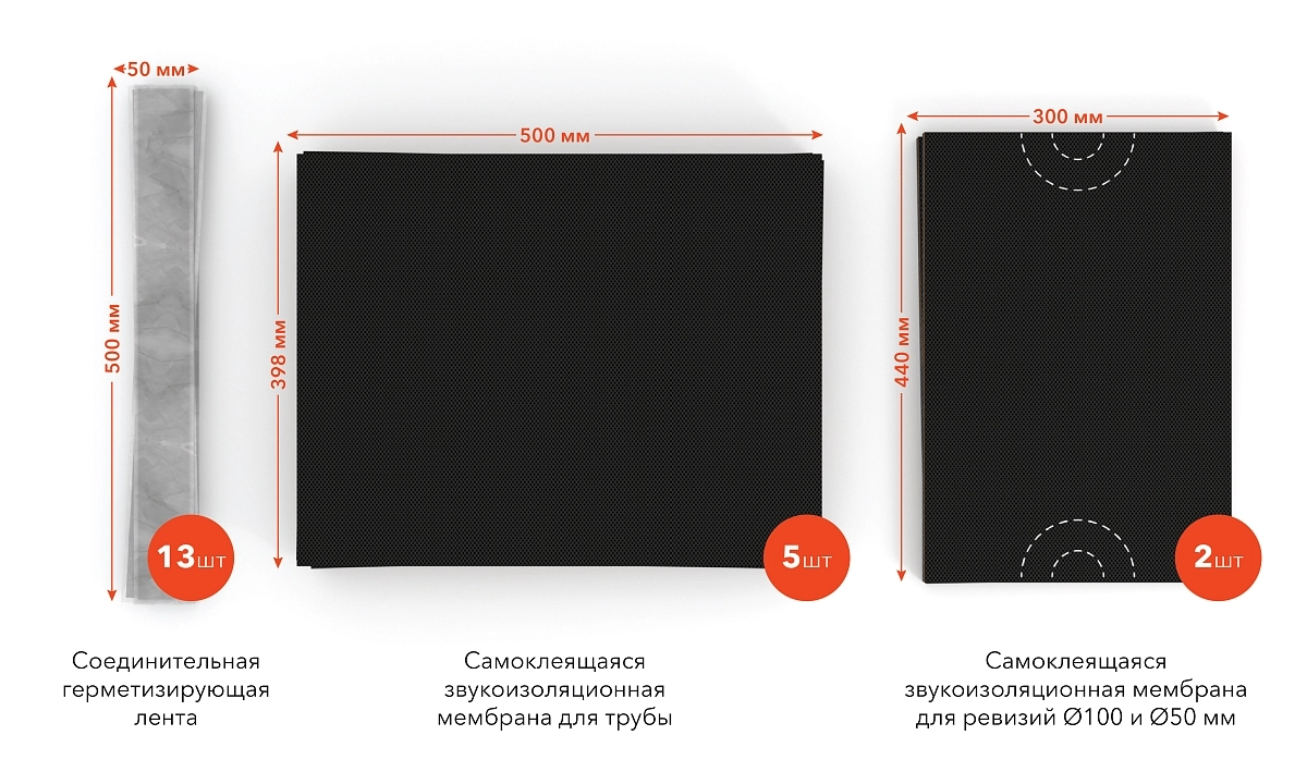 В комплект входит 5 универсальных листов размером 398х500 мм и 2 листа для раструбов и фиттингов, на которых пунктиром обозначены вырезы под трубу 50/110 мм.